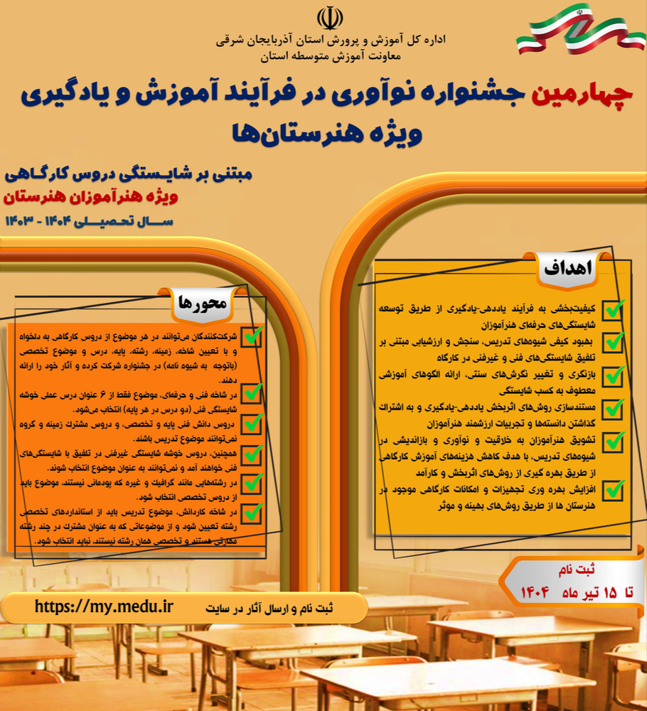 📢 جشنوارهها فرصتی ارزشمند برای دبیران و هنرآموزان خلاق، نوآور و دغدغهمند تا تجربیات خلاقانه خود را با دیگران به اشتراک بگذارند.